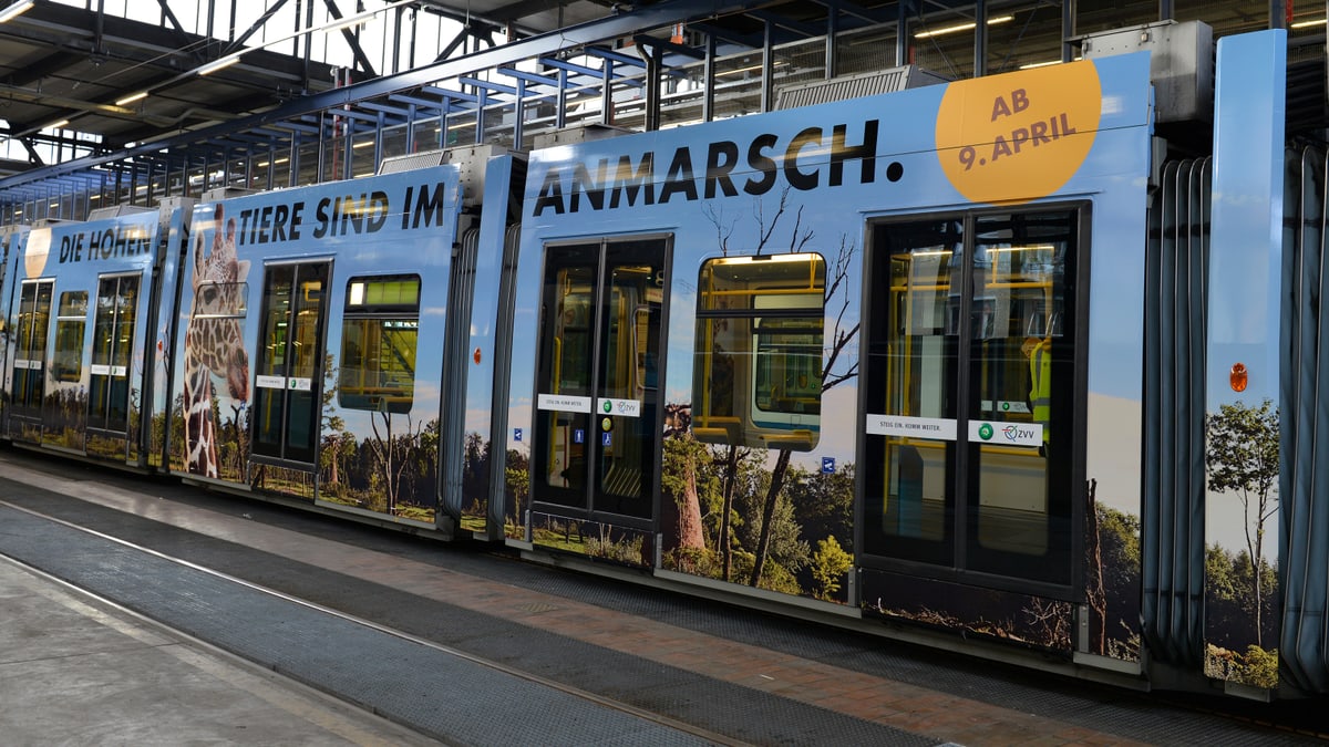 Ab heute Dienstag, 3. März 2020, grüssen grosse Giraffen von einem Cobra-Sondertram, das der Zoo Zürich und die VBZ gemeinsam entwickelt haben. Im Innern begrüssen Erdmännchen die Fahrgäste, während Giraffen-Hufspuren den Boden zieren. Auch Nashörner, Zebras, Strausse und Hyänen begleiten die Fahrt. Sie alle werben für die neue Lewa Savanne im Zoo Zürich, die ab dem 9. April 2020 geöffnet ist.