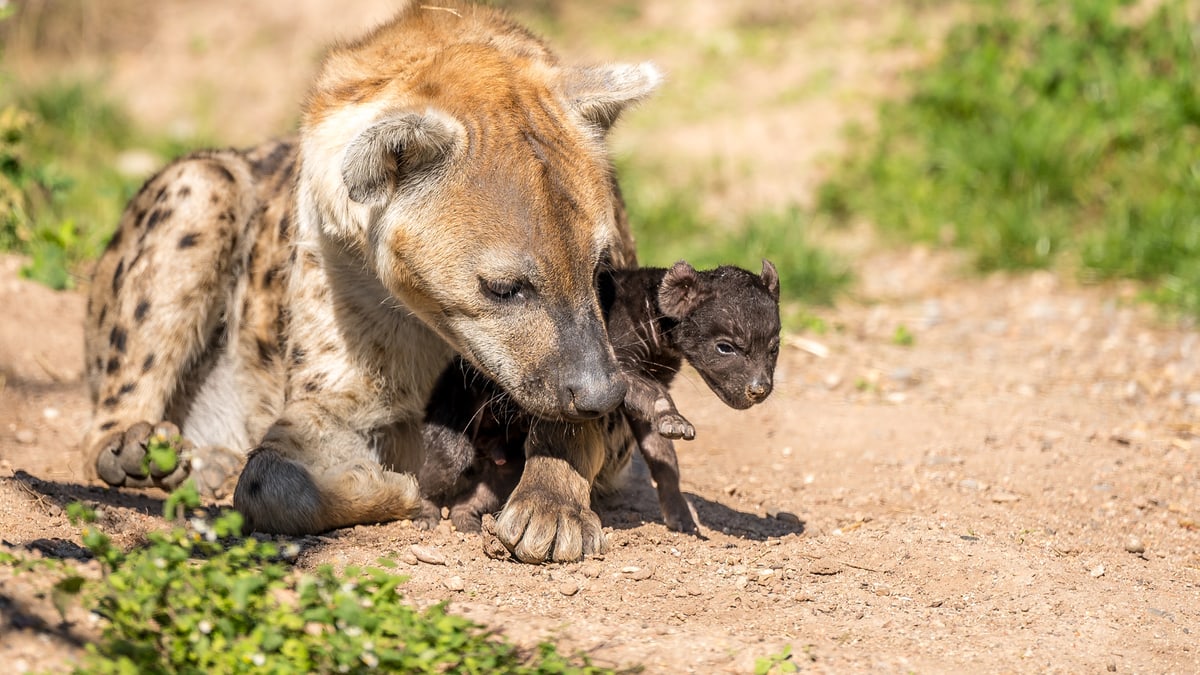 In der Natur verbringen Tüpfelhyänen-Jungtiere die ersten zwei bis fünf Wochen nach der Geburt in einem separaten Bau, getrennt von der Gruppe. Danach ziehen sie in einen Gemeinschaftsbau um. Hier leben sie zusammen mit bis zu dreissig Jungtieren anderer Weibchen.
